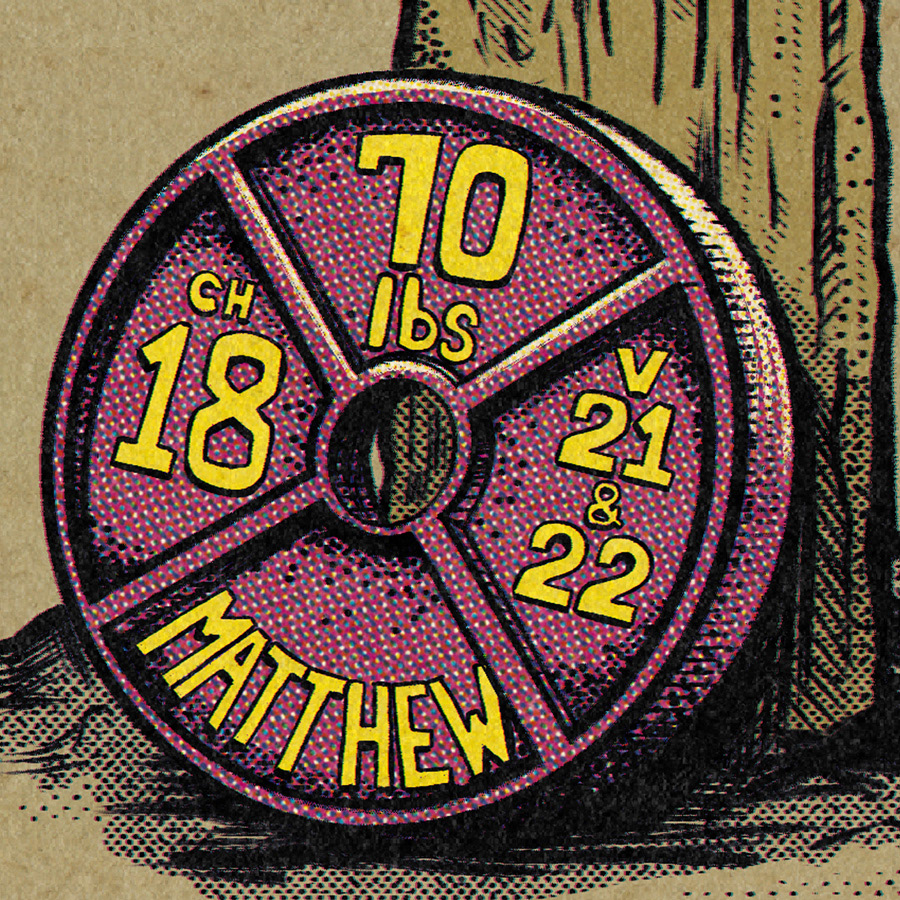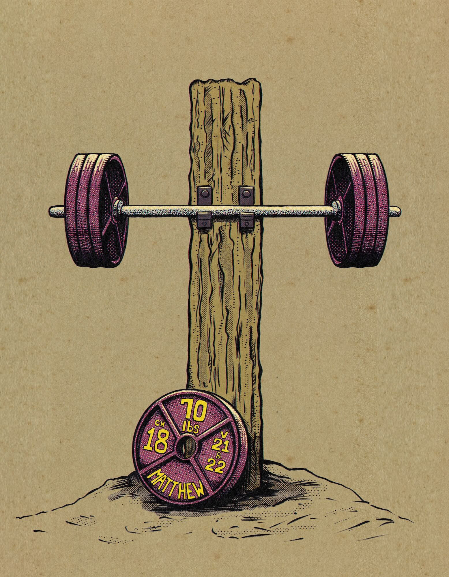 This piece translates Matthew 18:21–22 into a physical metaphor, visualizing forgiveness as weight carried over time. The loaded barbell reflects the repetition of “seventy times seven,” while the cross anchors that effort in Christ’s example. Like strength training, the act of forgiveness—repeated, often difficult—becomes the very thing that builds spiritual resilience. What begins as weight becomes the means of growth.