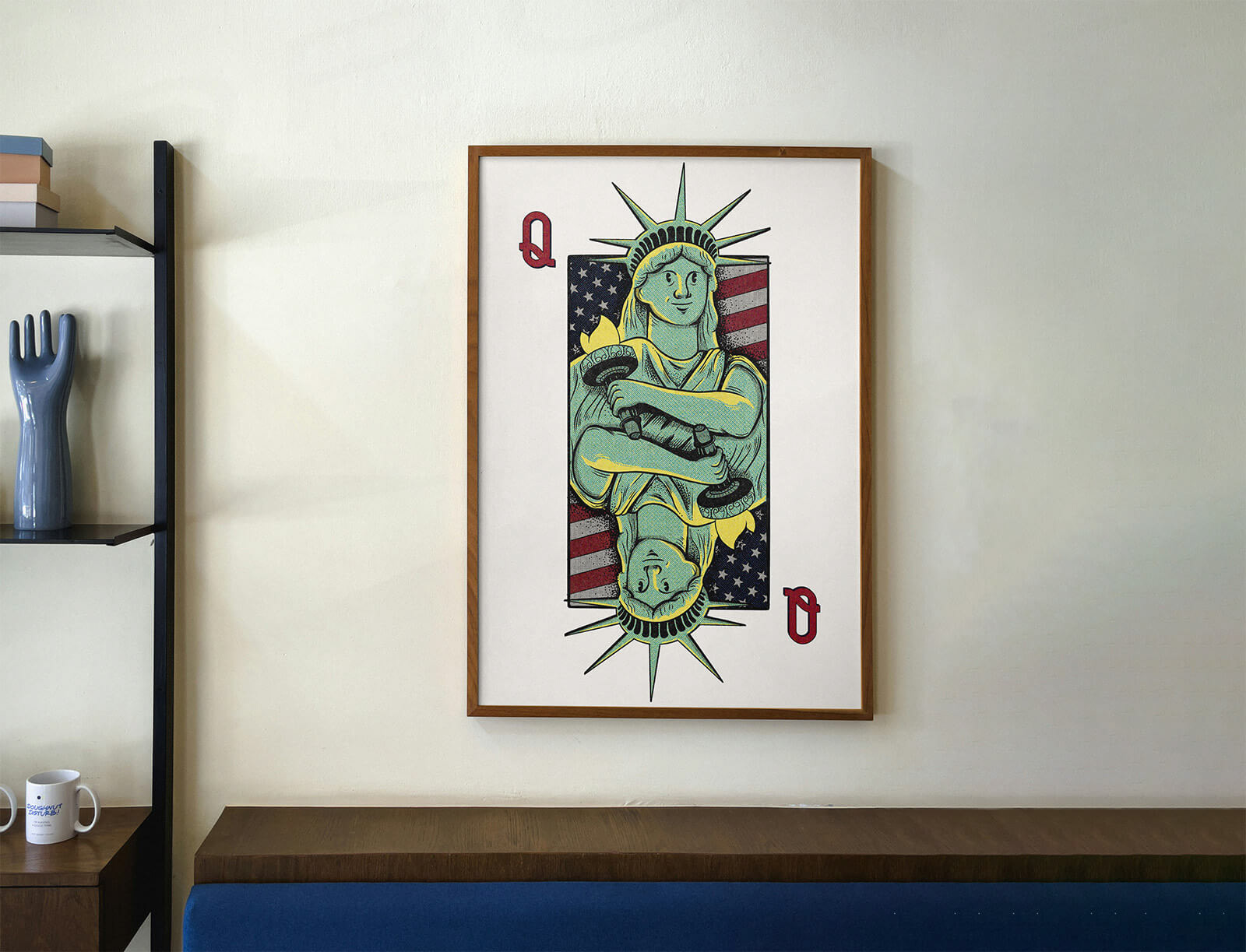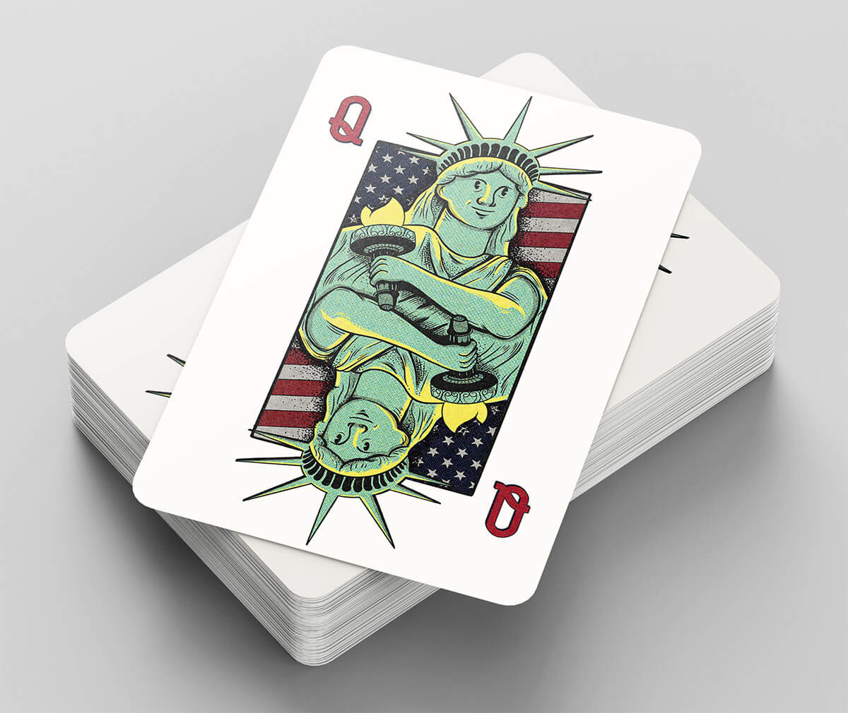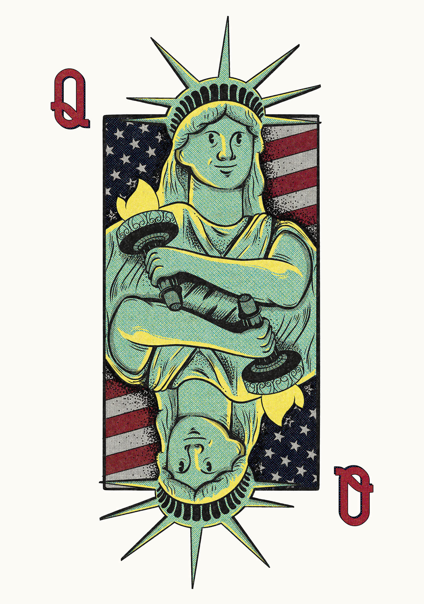 This piece reimagines the Statue of Liberty as a playing card, presenting freedom as both symbol and stake. The mirrored composition reinforces balance and duality, while the familiar iconography grounds the concept in national identity. The result is a visual that feels both recognizable and recontextualized.